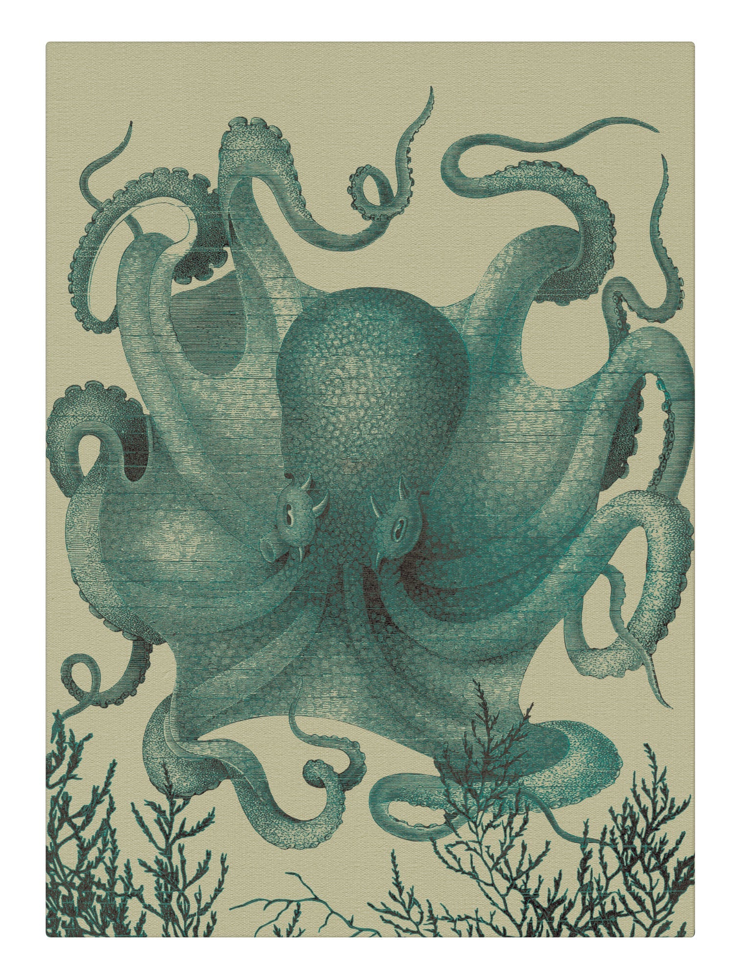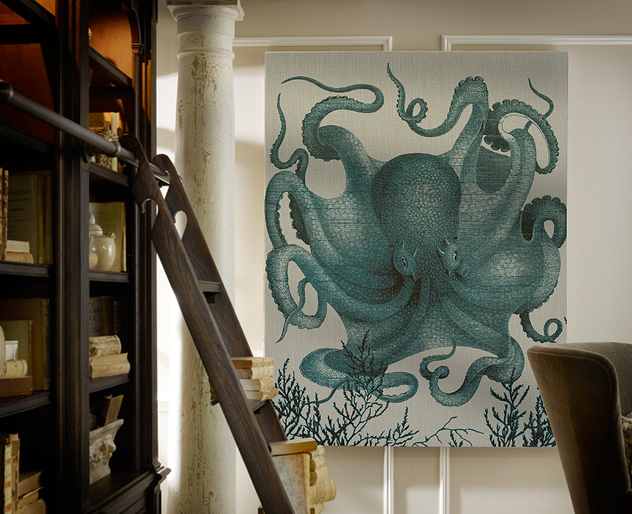 Fresh, modern and colorfully monochromatic, 19th-century octopus wall art makes waves in today’s homes.