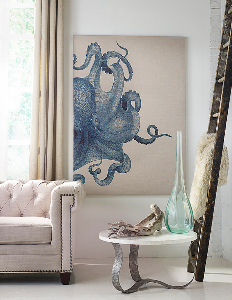 Fresh, modern and colorfully monochromatic, 19th-century octopus wall art makes waves in today’s homes.